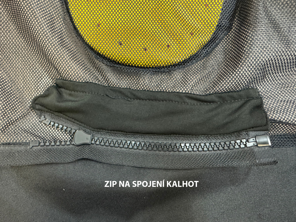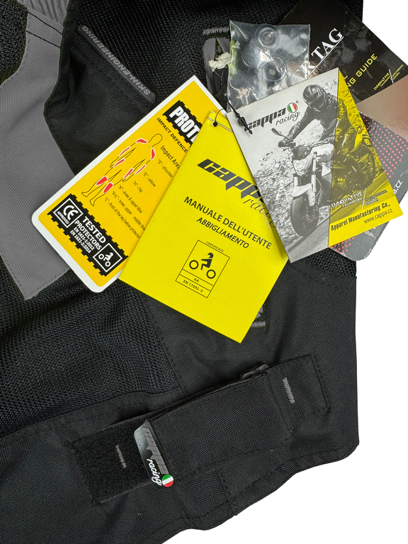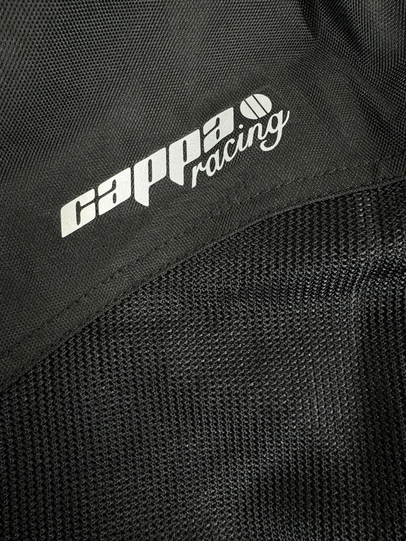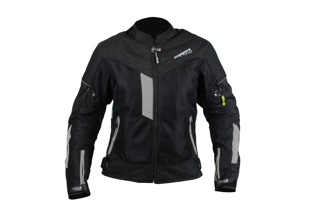 Giacca da moto estiva corta in tessuto con membrana impermeabile rimovibile. Rete traspirante sulla maggior parte della superficie. Con protezioni rimovibili per gomiti, schiena e spalle.