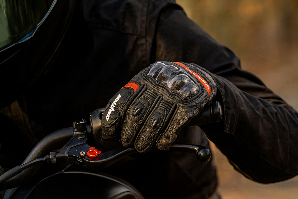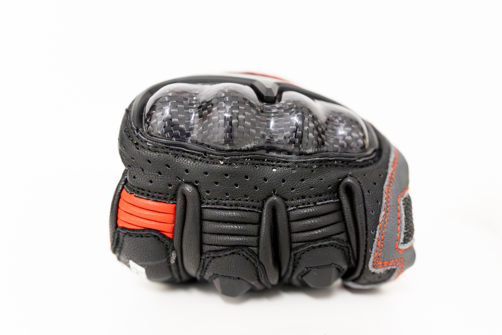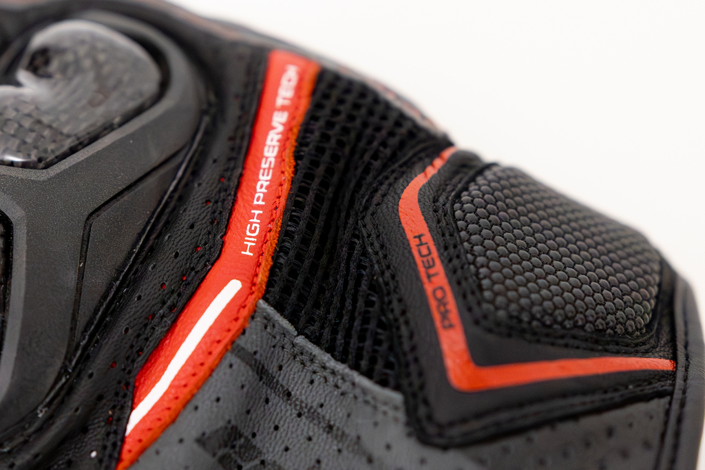 Guanti corti da moto in pelle nera, grigia e rossa, adatti alla stagione calda. Certificati con protezioni solide. Dito SmartTouch per il controllo del telefono.