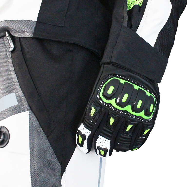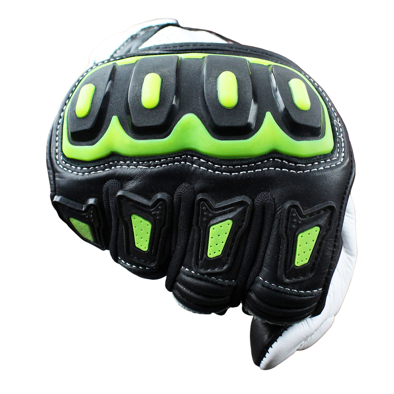 Guanti moto corti in pelle nei colori nero, bianco e verde, adatti al clima caldo. Certificati con protezioni rigide e morbide. Dito SmartTouch per l’uso del telefono.
