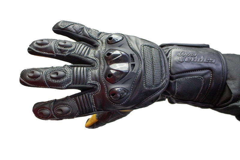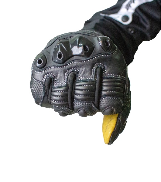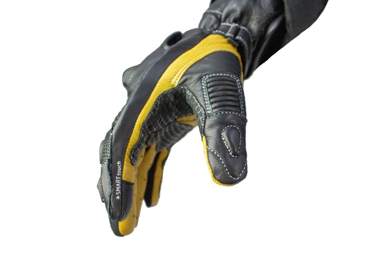 Guanti da moto lunghi in pelle SOCHI di colore nero/giallo. Certificato con protezioni rigide. Con un dito per controllare il telefono.