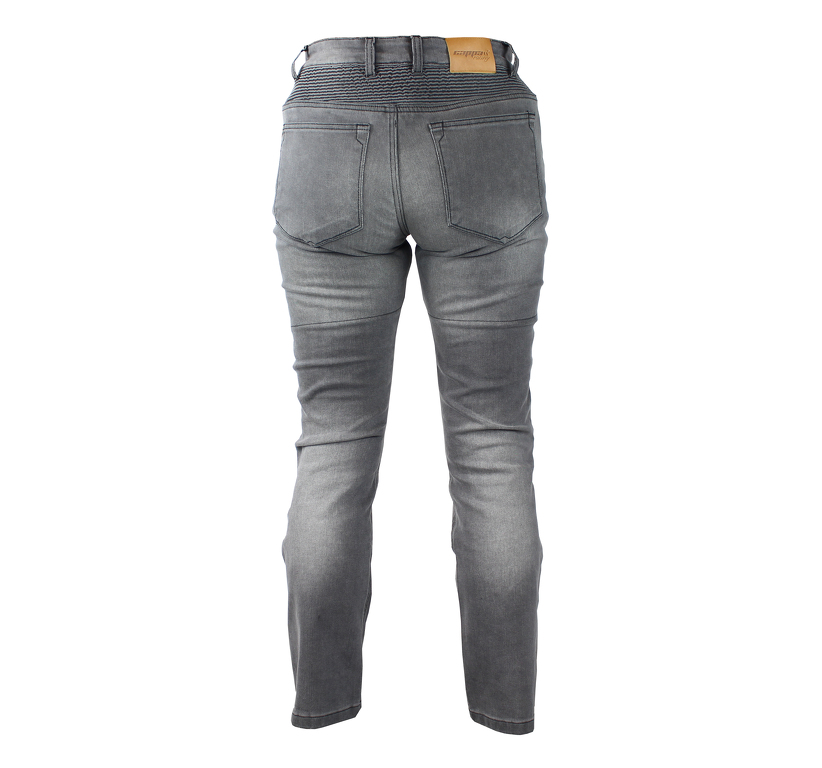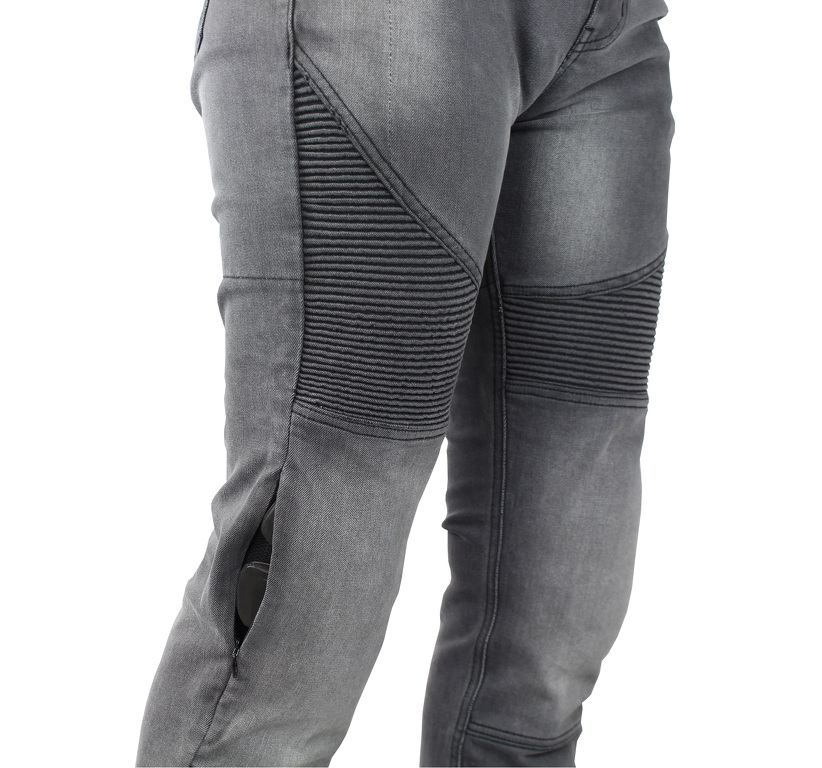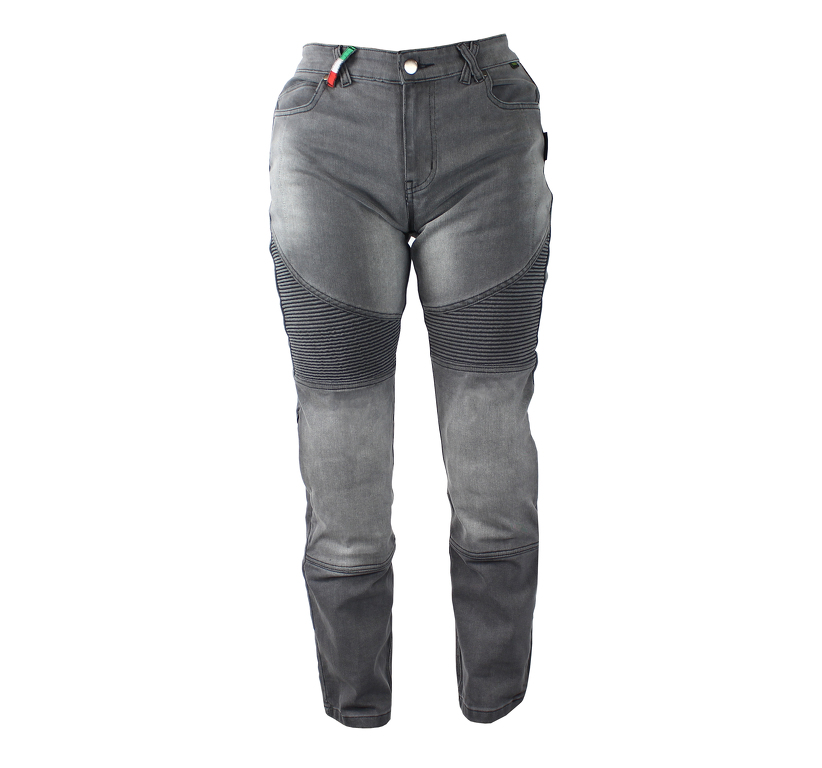 Pantaloni da moto da donna in denim, certificati con protezioni rimovibili per fianchi e ginocchia, rinforzati in Kevlar. Zone dei fianchi e delle ginocchia elasticizzate.