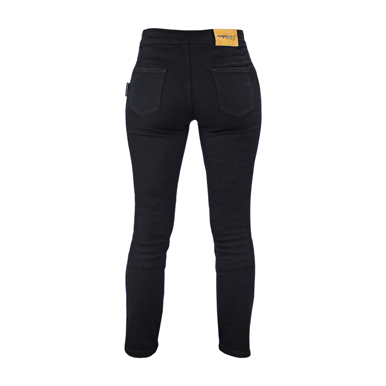 Jeans da moto da donna, certificati CE EN 17092-3, con protezioni rimovibili su fianchi e ginocchia. Rinforzati in kevlar, con tasche. Materiale altamente elastico e modellante.