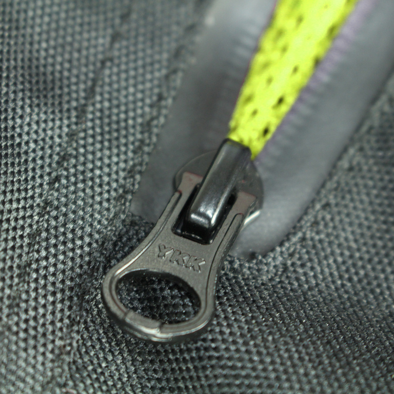 Pantaloni in tessuto da donna FIORANO con la fodera termica, protezioni, ventilazione. Colore nero con elementi verdi e riflettenti.