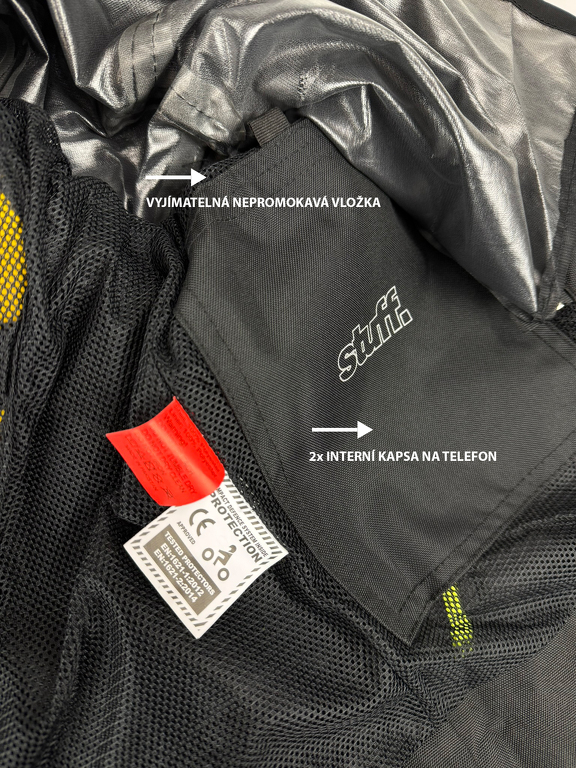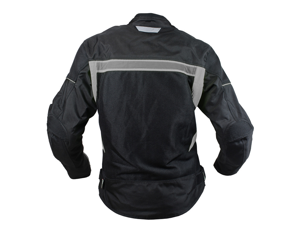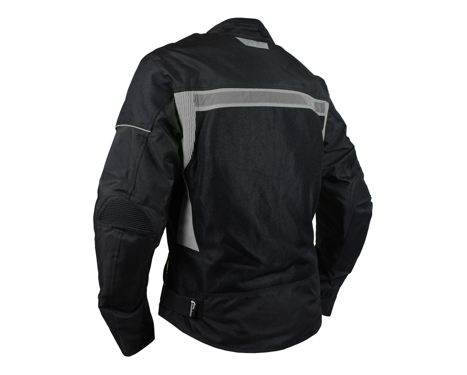 Giacca da moto estiva corta in tessuto con membrana impermeabile rimovibile. Rete traspirante sulla maggior parte della superficie. Con protezioni rimovibili per gomiti, schiena e spalle.