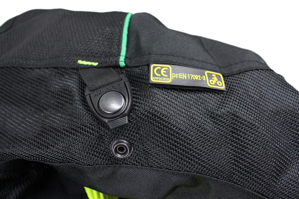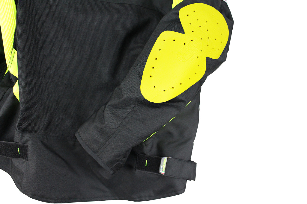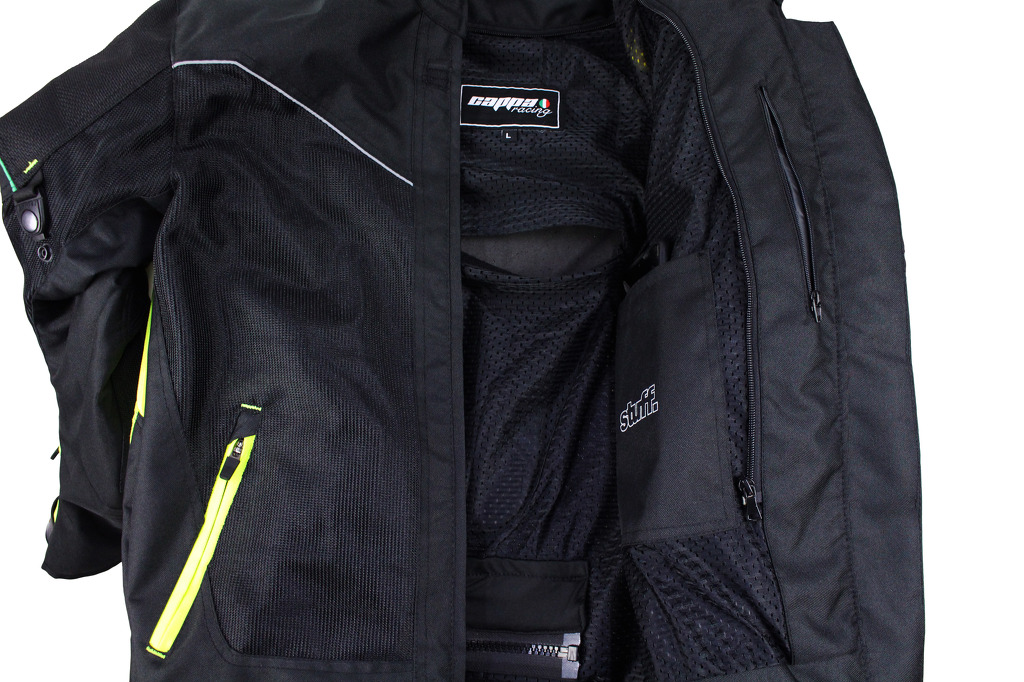 Giacca da moto estiva corta in tessuto con membrana impermeabile rimovibile. Rete traspirante sulla maggior parte della superficie. Con protezioni rimovibili per gomiti, schiena e spalle.