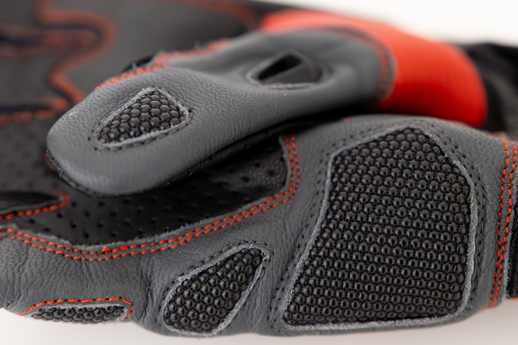 Guanti corti da moto in pelle nera, grigia e rossa, adatti alla stagione calda. Certificati con protezioni solide. Dito SmartTouch per il controllo del telefono.