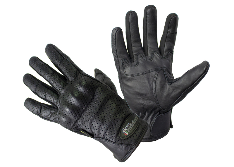 Guanti corti da moto in pelle nera. Certificati con protezioni solide. Leggeri e traspiranti, con chiusura in velcro.