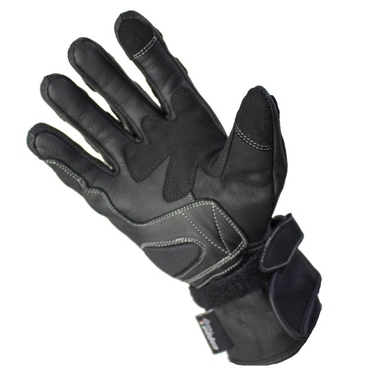 Guanti moto lunghi da uomo in pelle CAP, colore nero. Certificato con protezioni rigide. Con il dito per controllare il telefono. Chiusura in velcro.