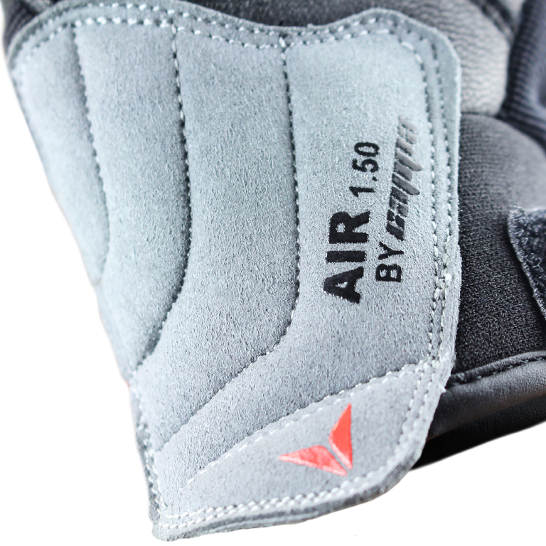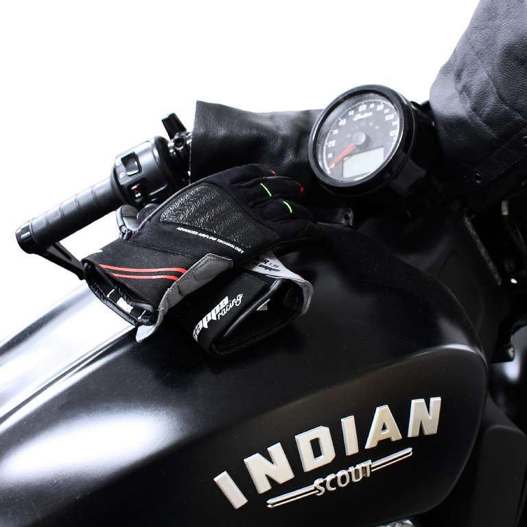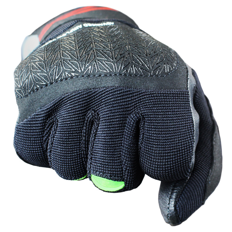Guanti moto corti in tessuto/pelle MIAMI di colore nero, unisex. Certificati con protezioni. Dorso traspirante e palmo in pelle.