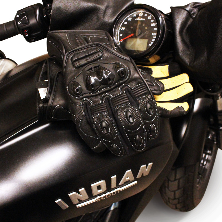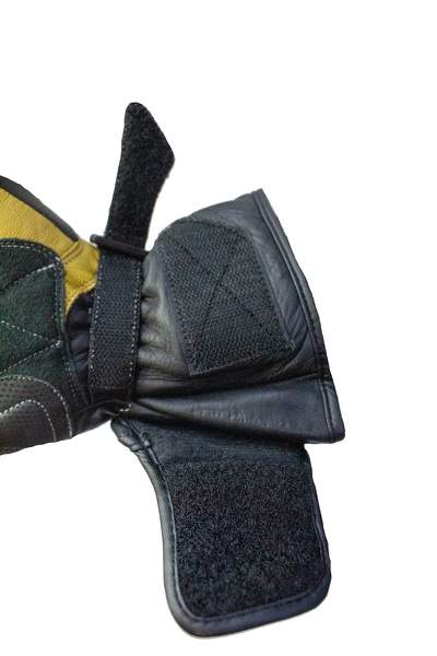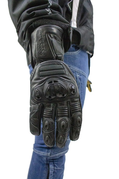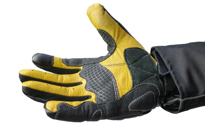Guanti da moto lunghi in pelle SOCHI di colore nero/giallo. Certificato con protezioni rigide. Con un dito per controllare il telefono.