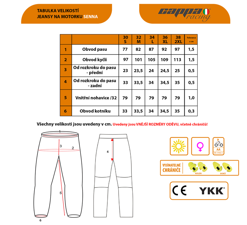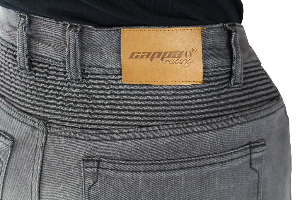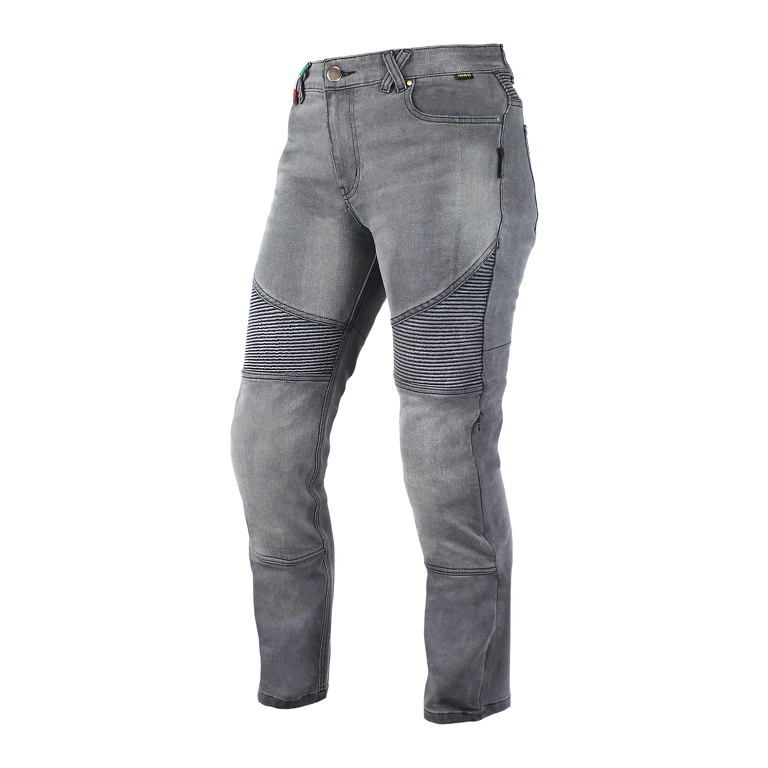 Pantaloni da moto da donna in denim, certificati con protezioni rimovibili per fianchi e ginocchia, rinforzati in Kevlar. Zone dei fianchi e delle ginocchia elasticizzate.