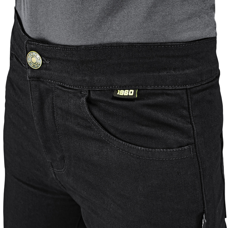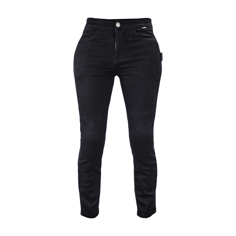Jeans da moto da donna, certificati CE EN 17092-3, con protezioni rimovibili su fianchi e ginocchia. Rinforzati in kevlar, con tasche. Materiale altamente elastico e modellante.