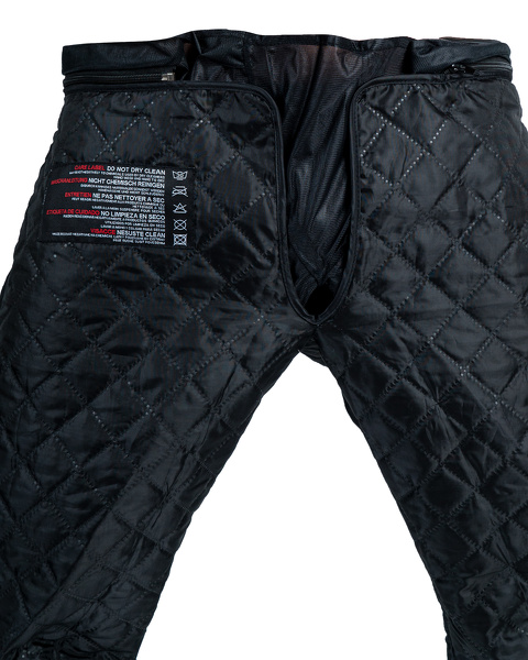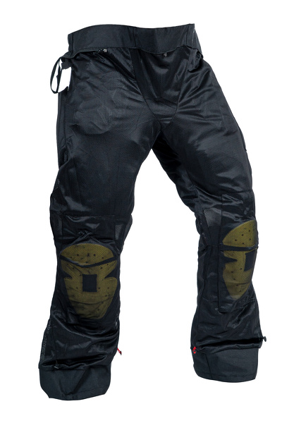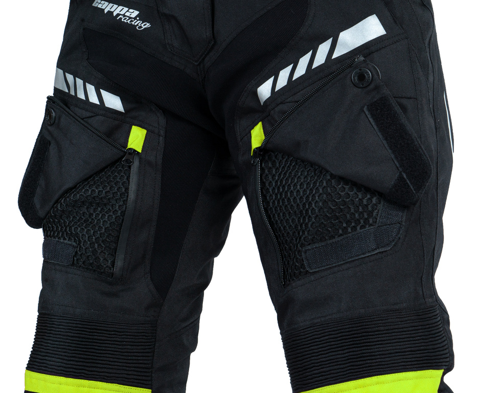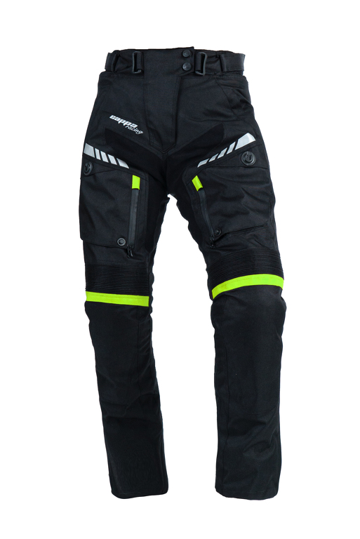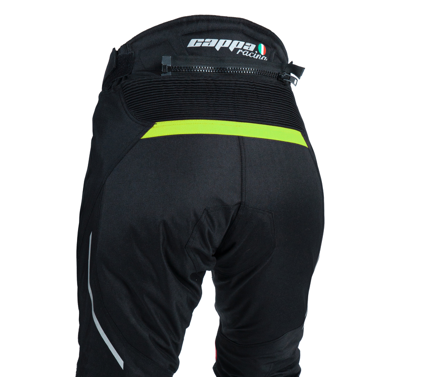 Pantaloni in tessuto da donna FIORANO con la fodera termica, protezioni, ventilazione. Colore nero con elementi verdi e riflettenti.